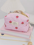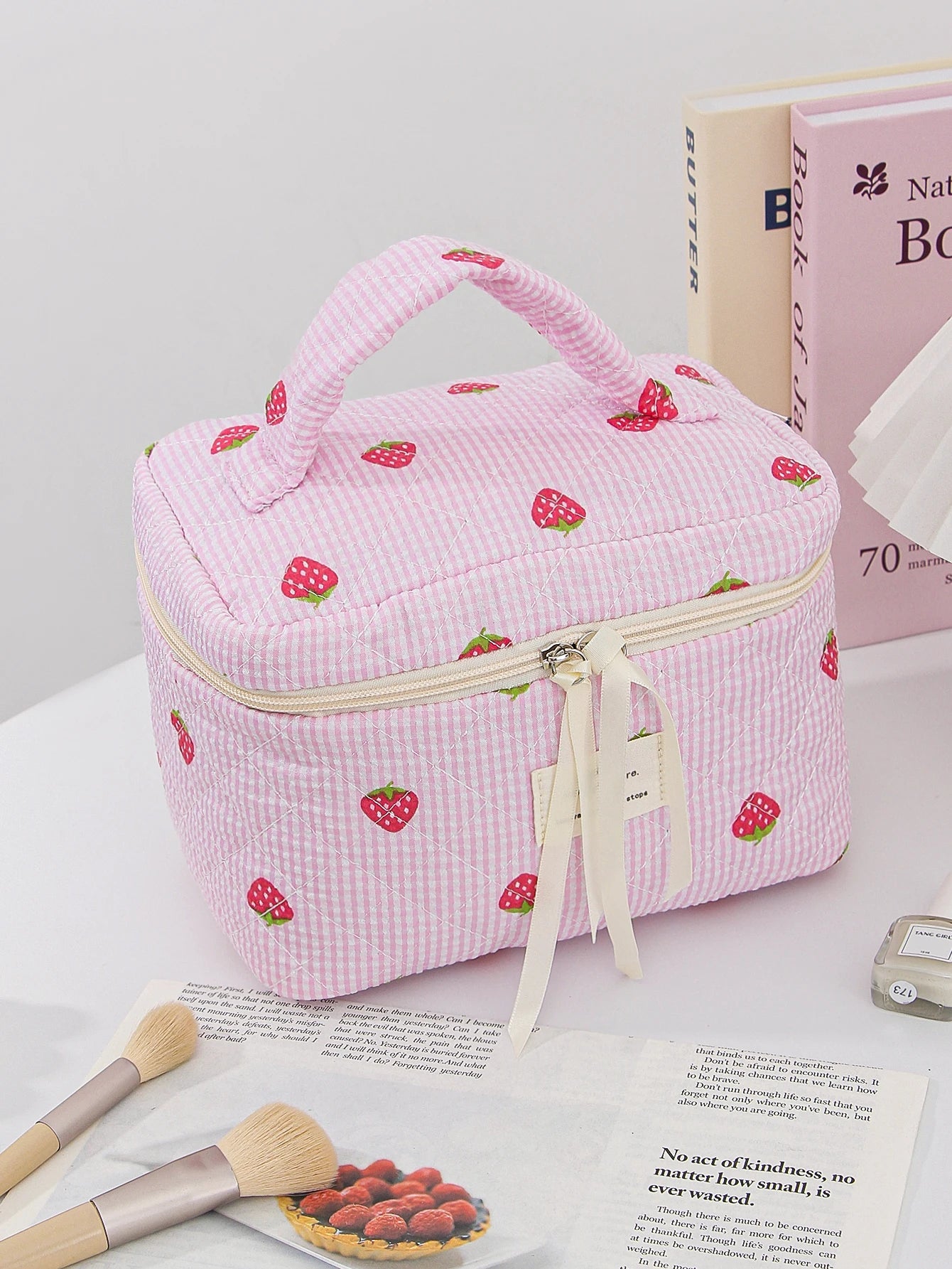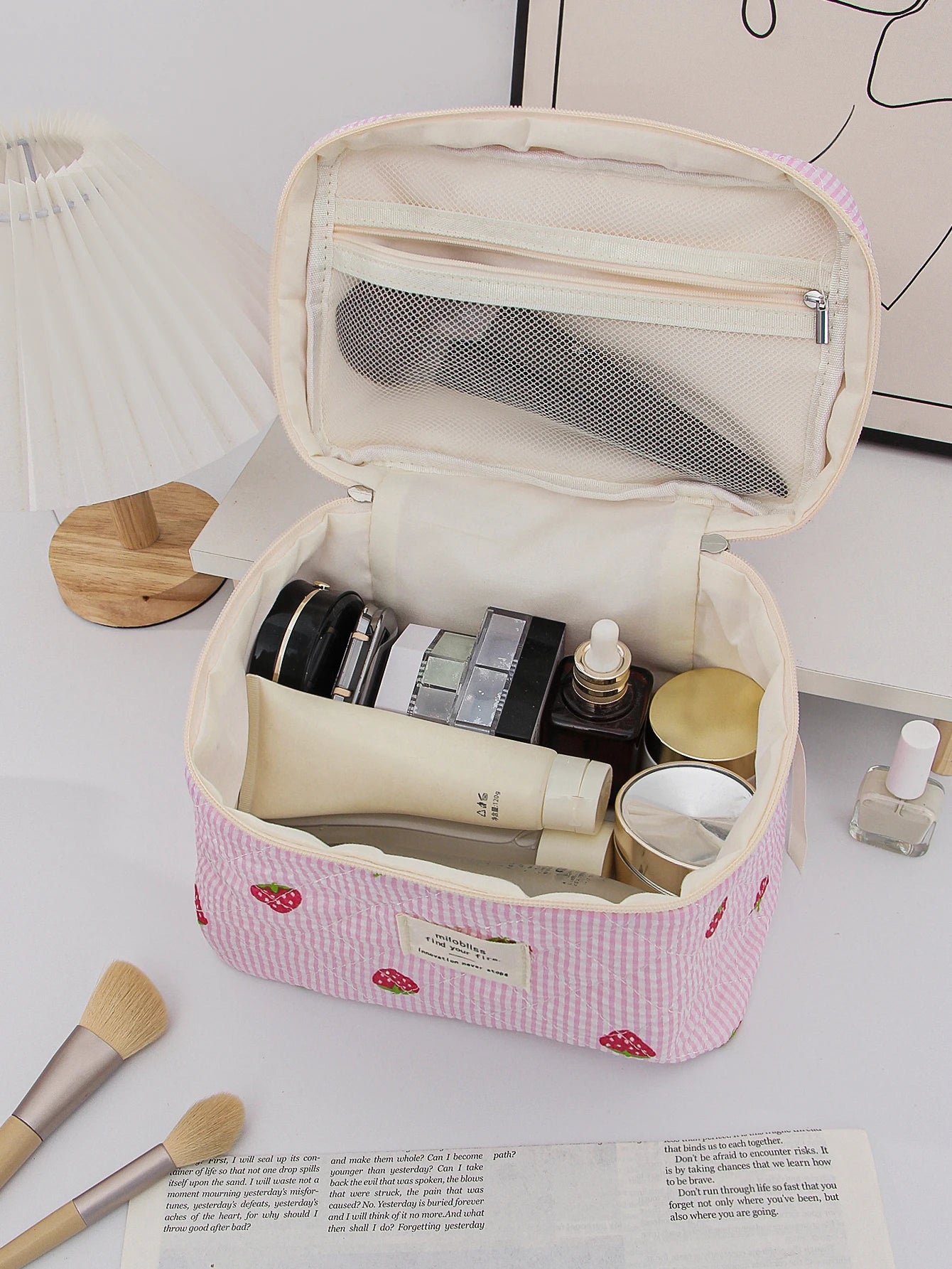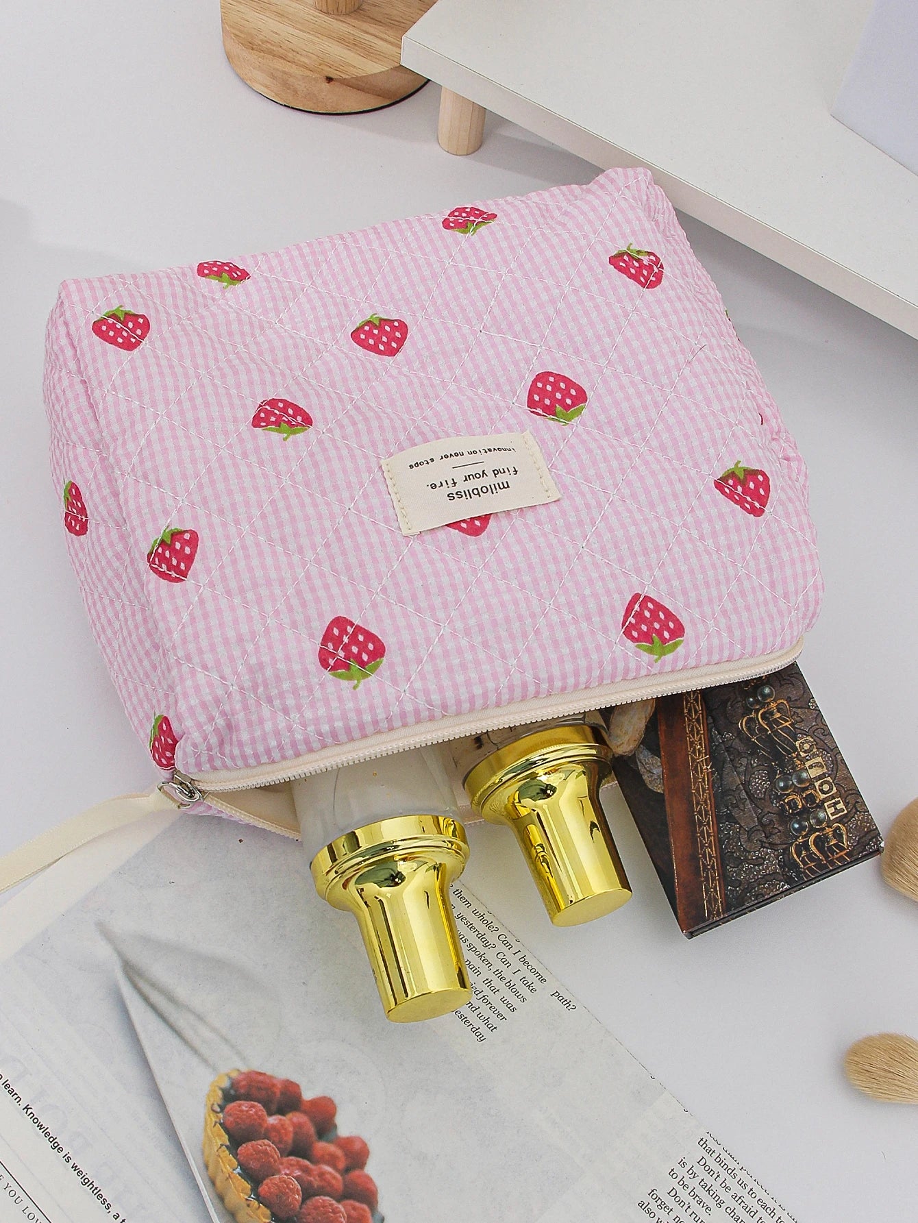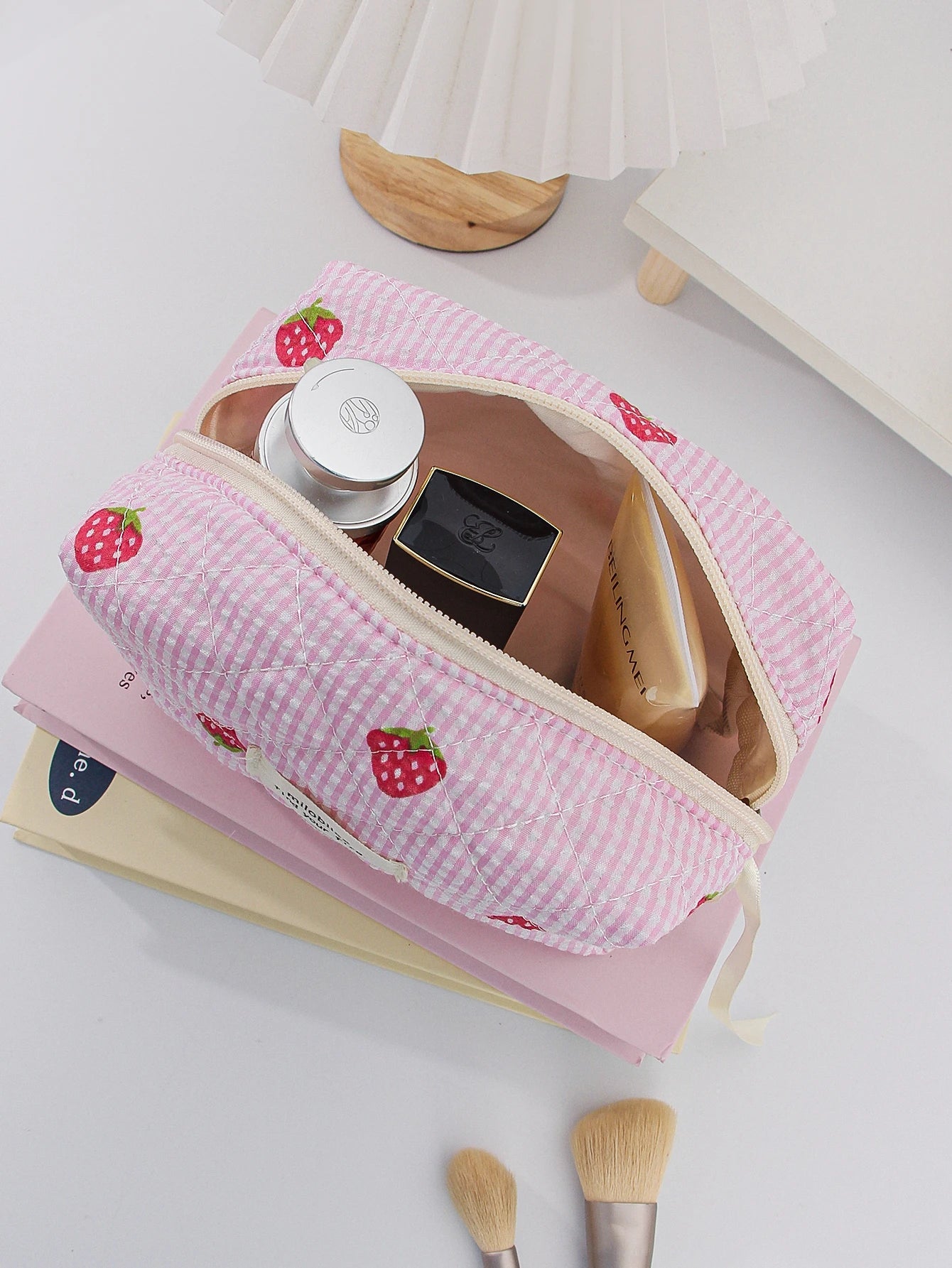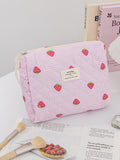 1pc/set Strawberry Quilted Makeup Bag, Travel Makeup Bag, Toiletry Makeup Bag, Portable Makeup Bag, Lightweight Storage Bag