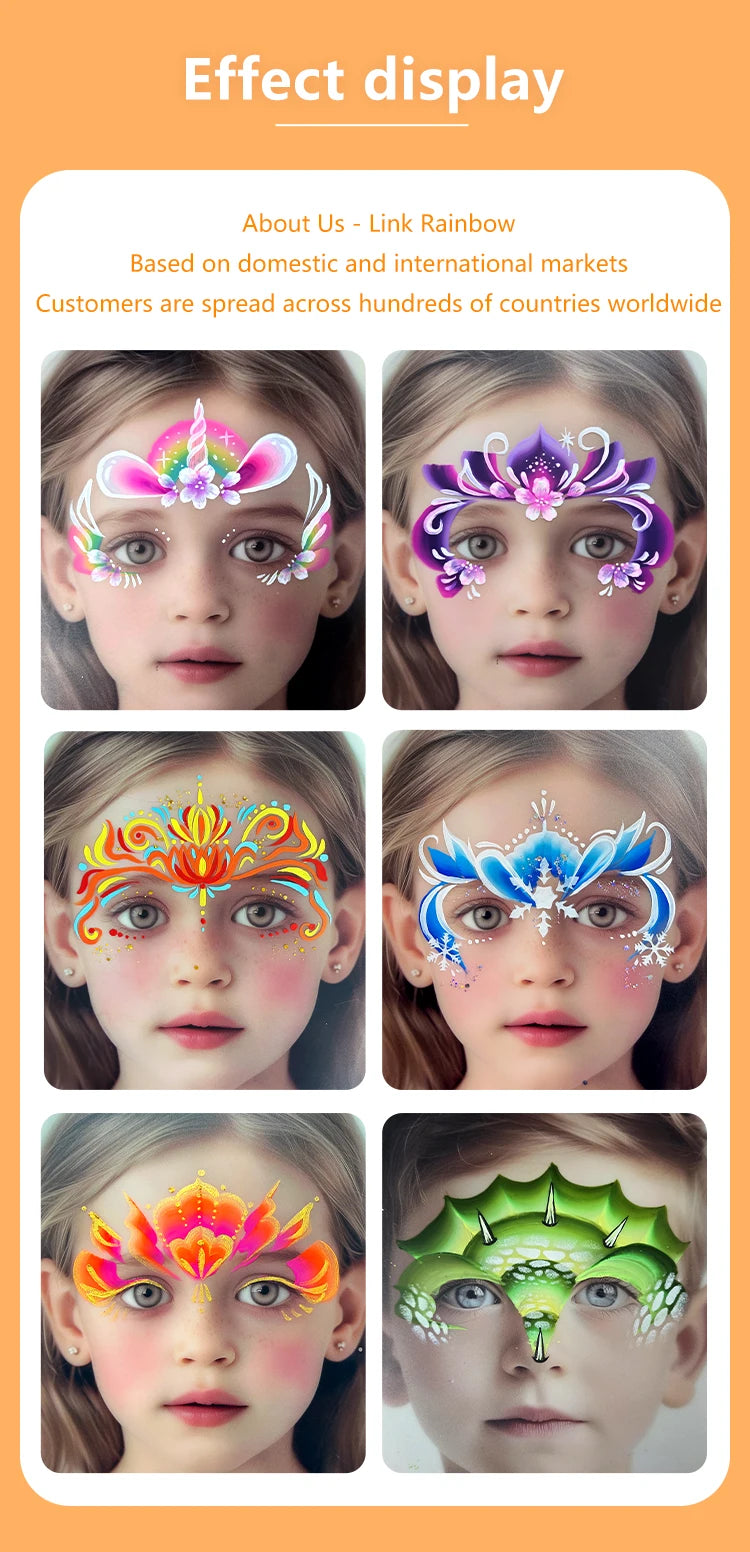 Usage: 1. Wet the paintbrush; 2. Dip in and adjust colors; 3. Quickly dry the color and paint freely on the skin. The colors can be superimposed, and the base color can be applied after drying; 4. Dark tones may leave some residue on the skin and need to be cleaned again with soap or shampoo.